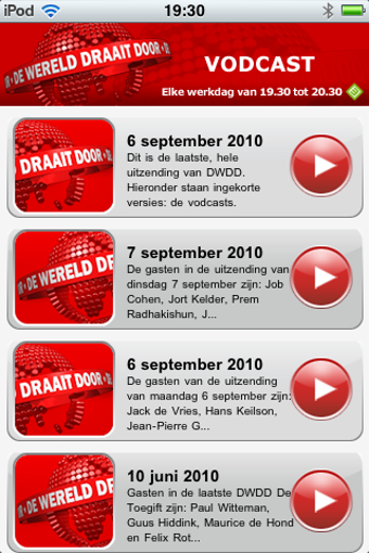 Bovenaan het menu staat in grote letters 'Vodcast' naast het De Wereld Draait Door-logo. Het gaat namelijk om 3 minuten lange filmpjes die ook als video podcast op de website van de talkshow staan. Om een samenvatting te bekijken, druk je op de rode afspeelknop die achter elke aflevering staat. De beelden openen hierna in een YouTube-achtige speler en nemen het hele scherm in beslag.